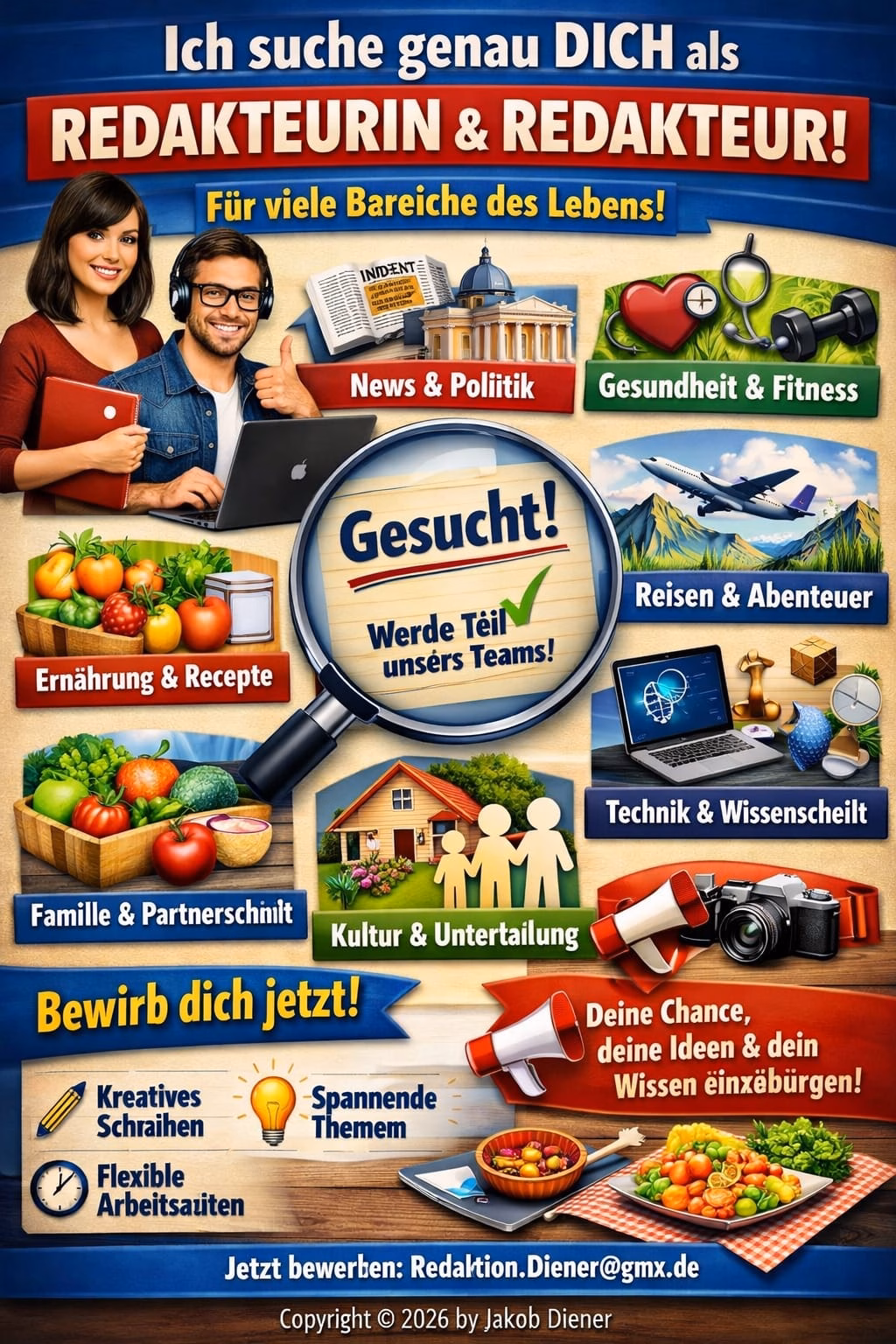 - Für mehrere meiner thematisch unterschiedlich ausgerichteten Webseiten suche ich eine engagierte Redakteurin oder einen engagierten Redakteur, die oder der Freude am Schreiben hat, über echte Lebenserfahrung verfügt und Inhalte aus persönlicher Praxis authentisch, verständlich und sprachlich einwandfrei vermitteln kann.